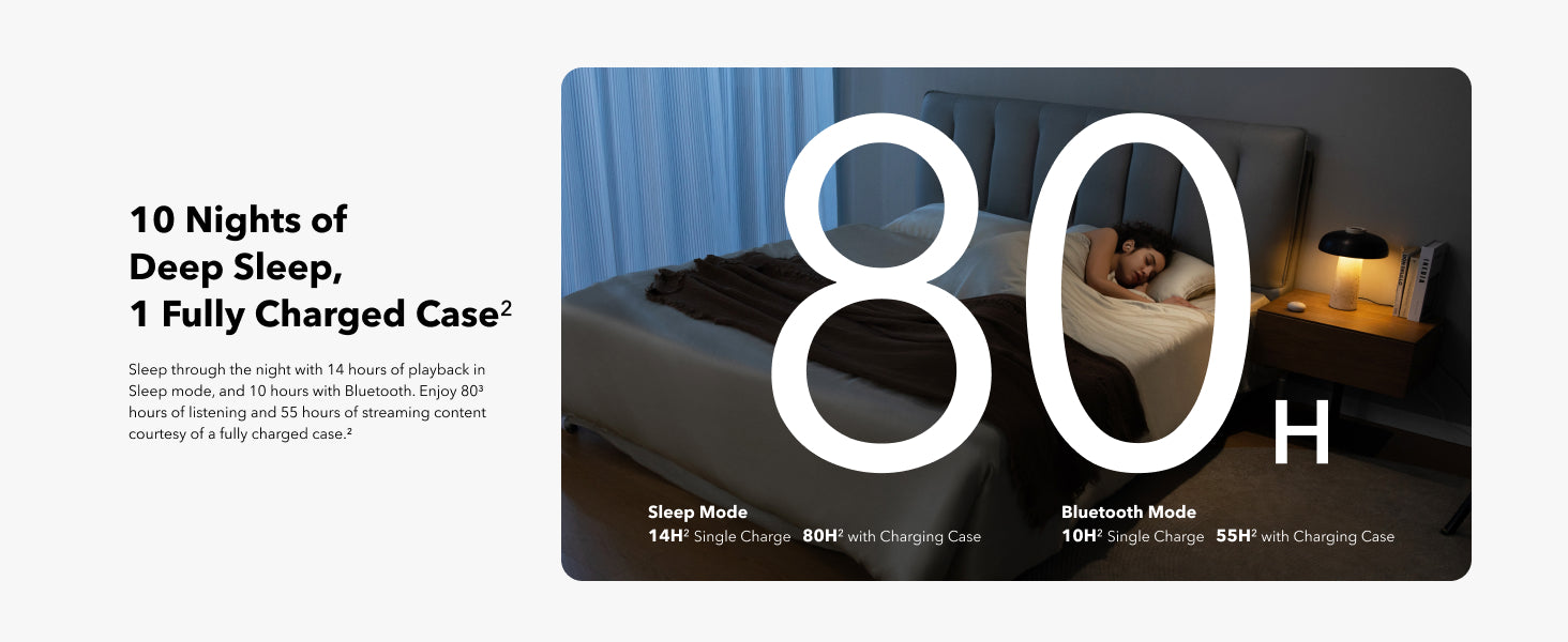 Ultra-Long Playtime:Sleep mode boasts 14 hours of battery life on a single charge, extended to 80 hours with the case. Bluetooth mode offers 10 hours of playtime, with an additional 55 hours via the charging case.