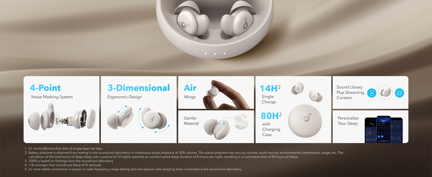Ideal for Side Sleepers:Sleep A20 utilizes the combined efforts of soundcore’s Air Wing and 3D ergonomic design—wrapped in an ultra-soft material—for the added benefit of pressureless comfort, even when sleeping on your side.